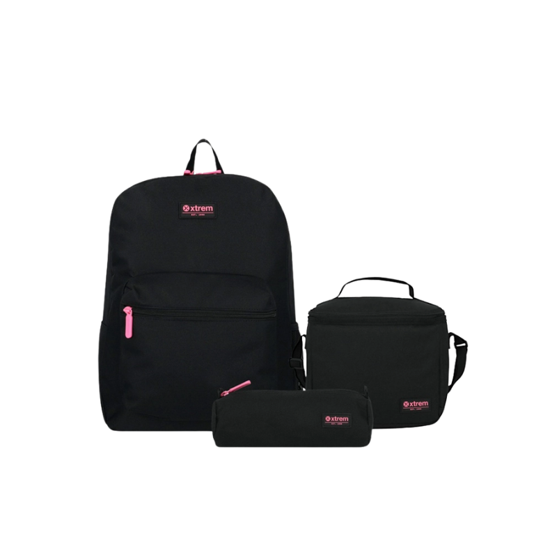 Combina, brilla y triunfa con el look más cool de la temporada en match negro y rosado. ¡Este año, tu mejor accesorio es tu Xtrem! Haz tuyo el set mochila, estuche y lonchera hoy mismo.